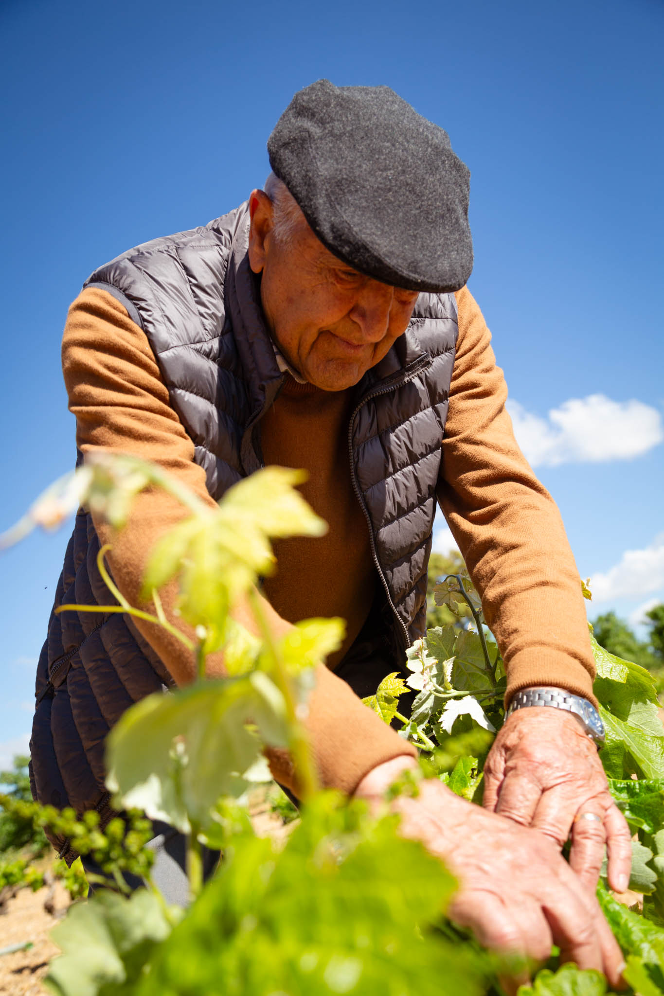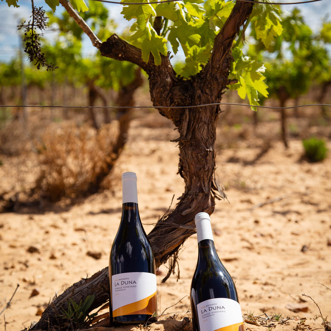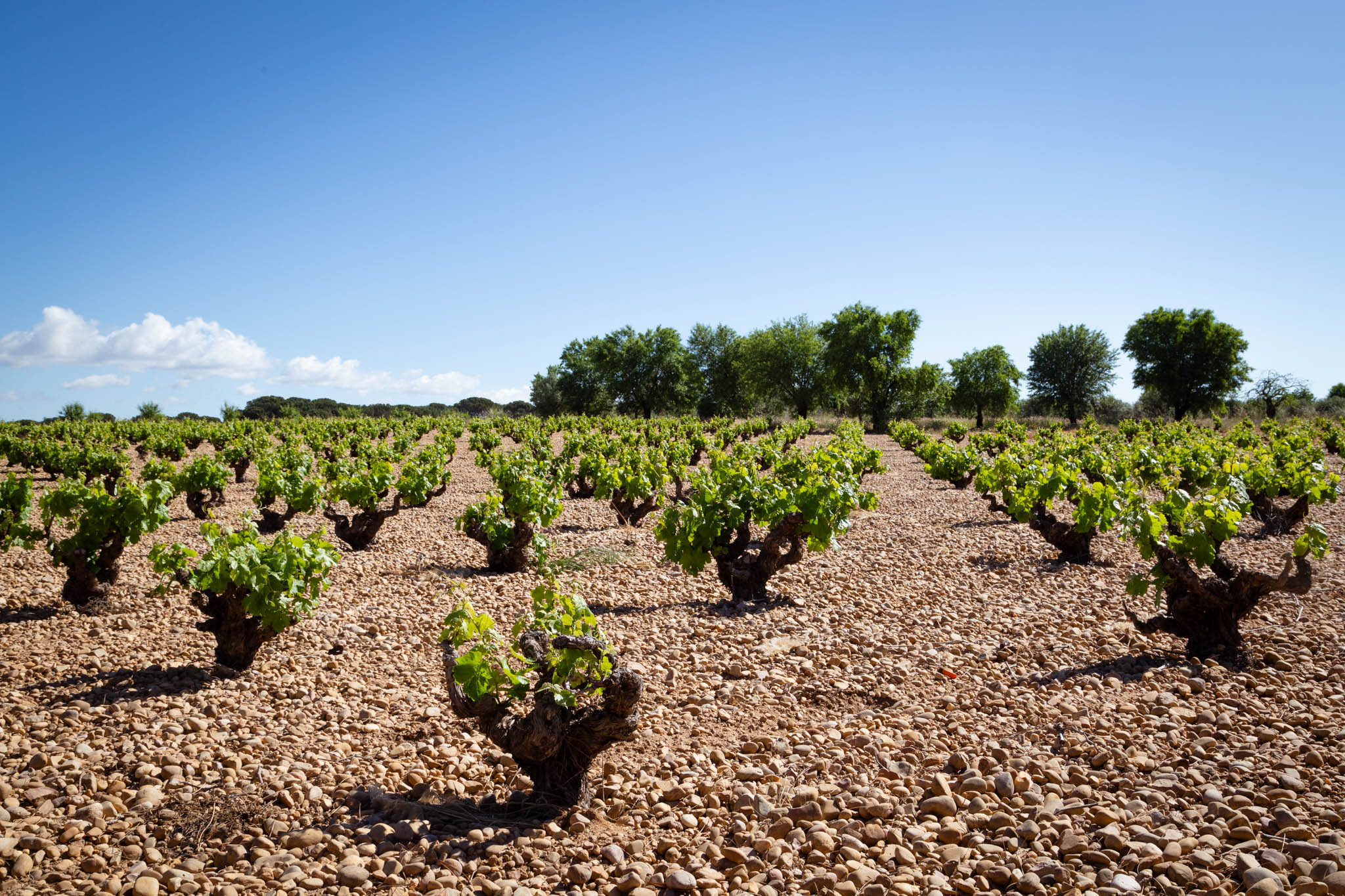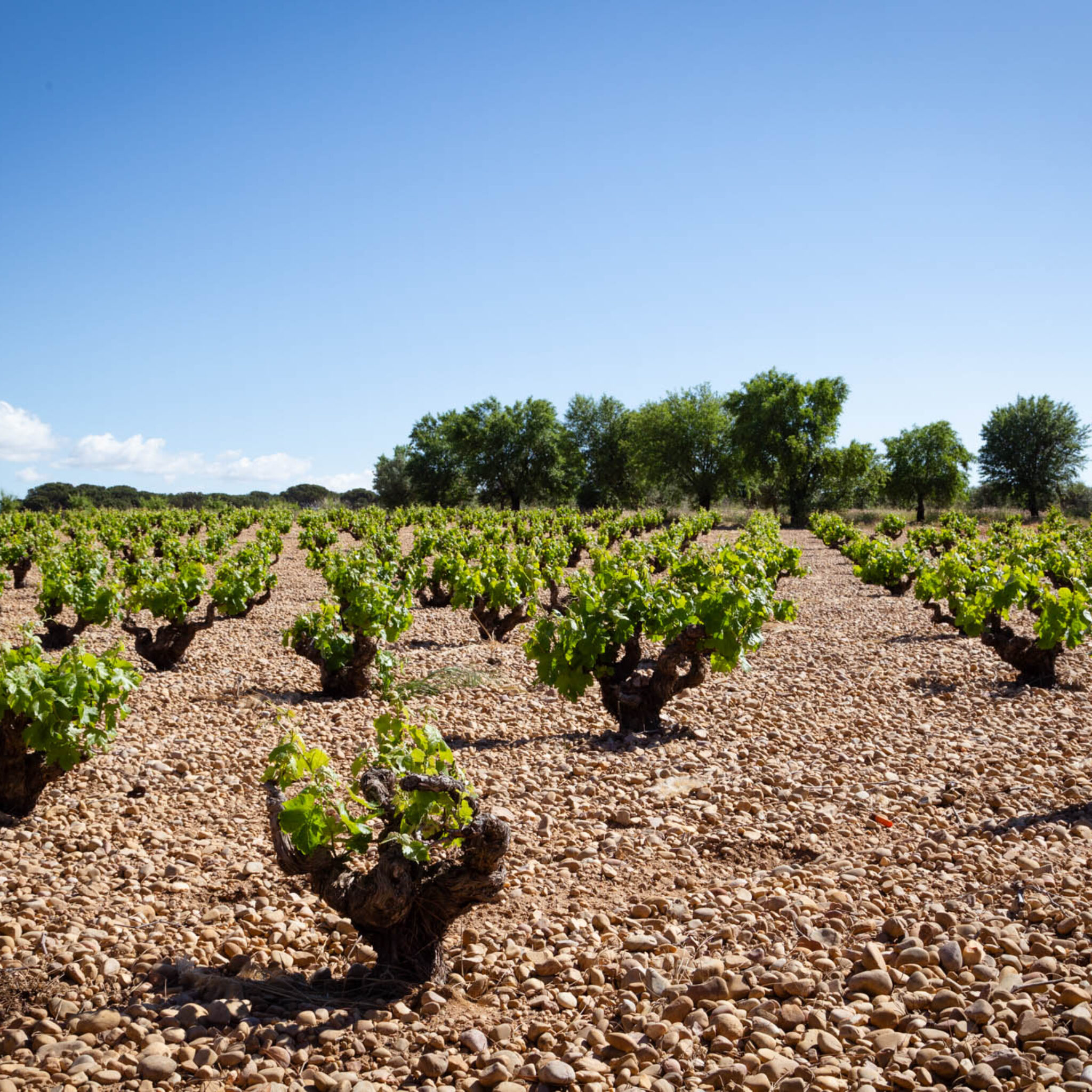 Nuestros viñedos están asentados sobre suelos variados —desde texturas franca a franca arenosa, con presencia de limo y arcilla— y una capa superficial de cantos rodados o guijarros, huella del antiguo cauce del río Júcar. Estos suelos ofrecen un excelente drenaje, obligan a las raíces a buscar profundidad y concentran minerales que se traducen en vinos con carácter y estructura. El clima es marcadamente continental mediterráneo: veranos cálidos y secos e inviernos fríos. Esta amplia oscilación térmica entre día y noche es un factor clave para el desarrollo de aromas y el equilibrio entre azúcar y acidez en las uvas. El entorno natural ayuda a moderar estas condiciones, permitiendo un crecimiento sano de la vid y una expresión varietal más rica. El paisaje que rodea los viñedos combina pastizales, bosque mediterráneo y zonas de matorral, promoviendo un ecosistema equilibrado. Esta biodiversidad no solo es un valor medioambiental, sino que también favorece prácticas vitícolas respetuosas y un estado sanitario de nuestros viñedos que se refleja en la calidad de la uva.